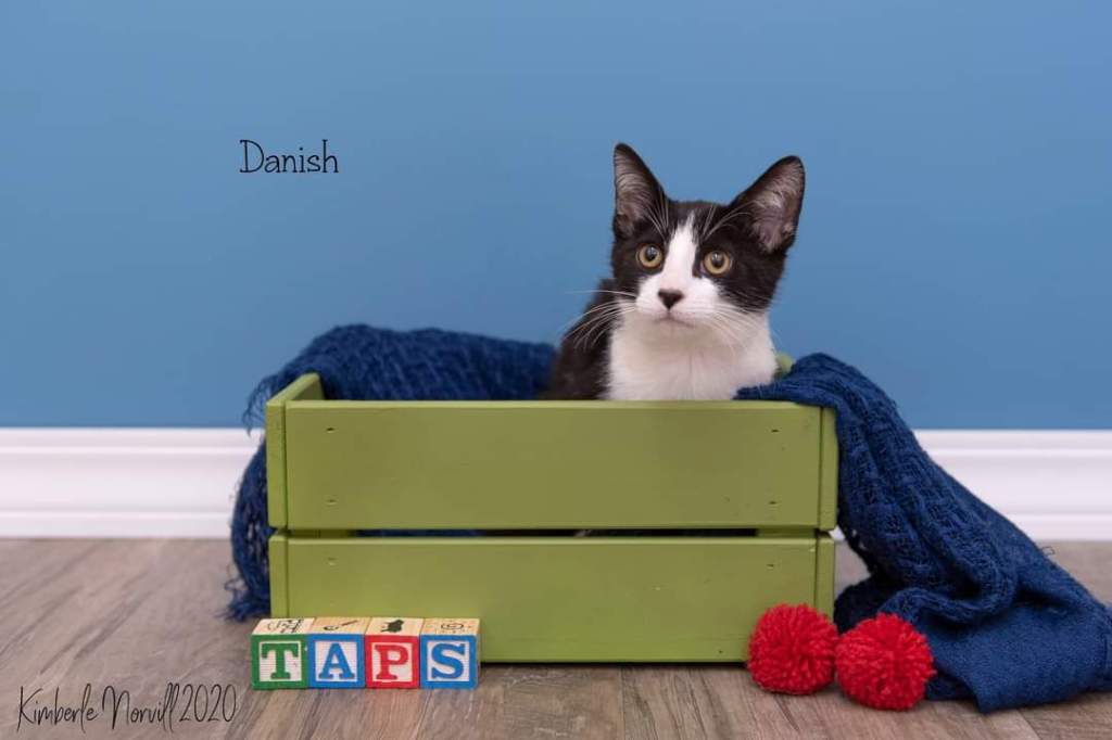 Hi there, I’m Danish and I am 5 months old. I am a darling, tuxedo boy, here with some friends from a nearby animal control. I am a bit shy, but sweet and gentle. I am learning that toys are fun, that people are kind, and holding and petting are good. I am friendly and my timidness is disappearing more and more each day. If you think that you could be my forever family, love me and bring me out of my shell completely, please fill out an application and let’s get to know each other!