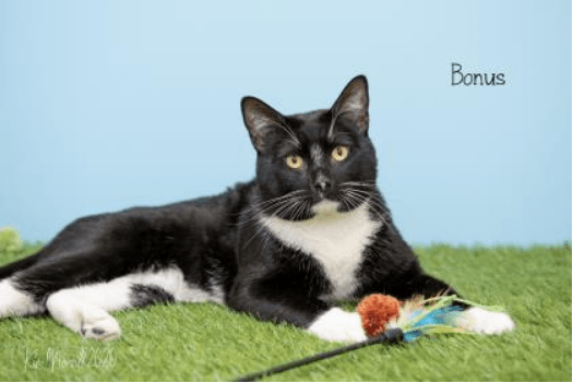 Hi there, I’m Bonus and I am 2 years old. I am a handsome, tuxedo boy, who was found alone by the federal prison and not reclaimed. How sad… I am just the sweetest!! I love to be petted and lay against my human friends making biscuits with my paws. How adorable is that?? I also like some toys and a bit of cat nip. I am calm, laid back, gentle, and get along just fine with the other cats in my cat room. What more could you ask for? If you think that I could be a good fit for your forever family, please fill out an application and let’s get together to see if we are the perfect match!!
