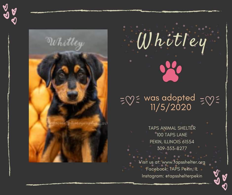 Adoptions for November 5, 2020 Posted bylindzamayNovember 6, 2020Posted inUncategorized Congratulations to Thumbprint, Moxie, and Whitley for finding their forever homes today! Share this:TweetLike Loading... Related