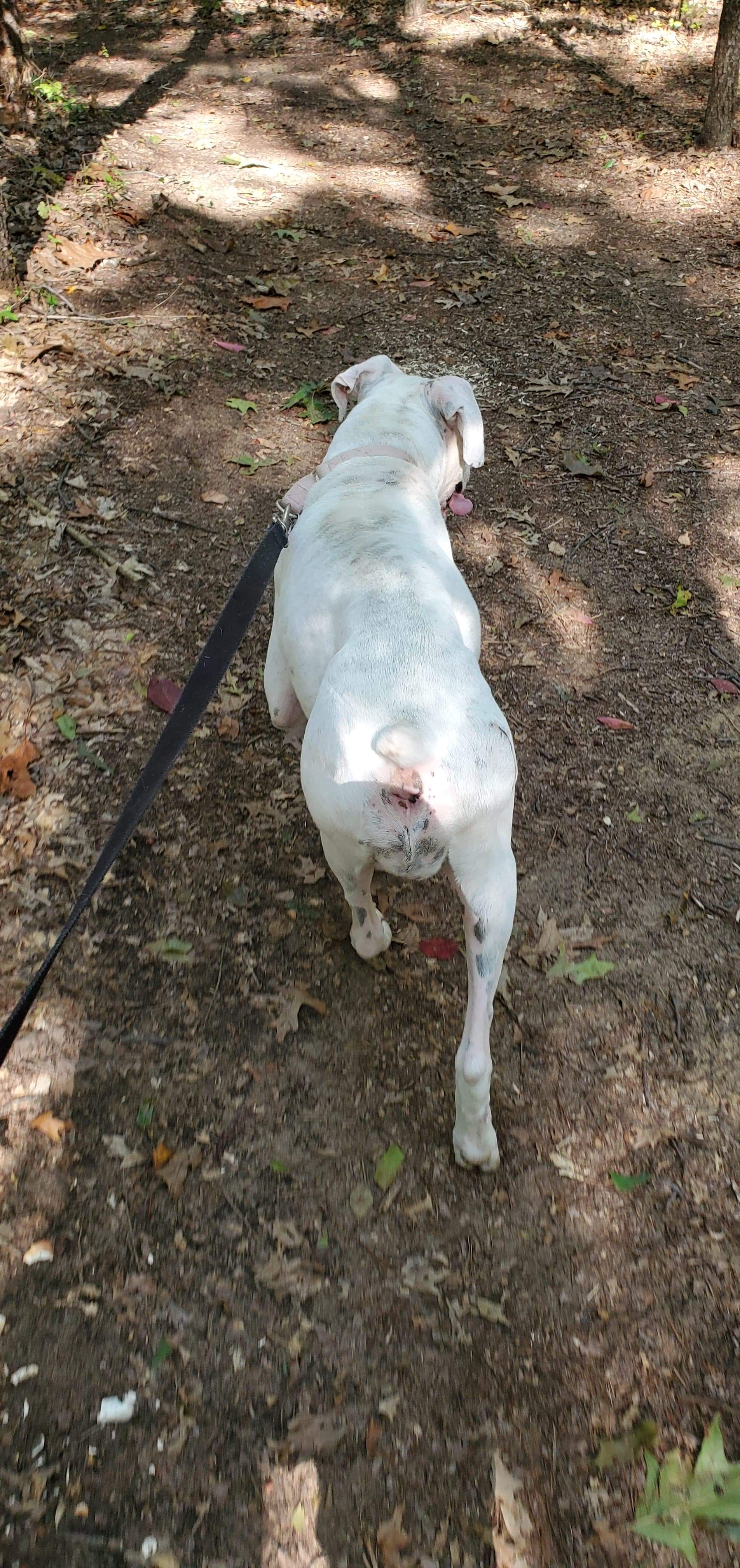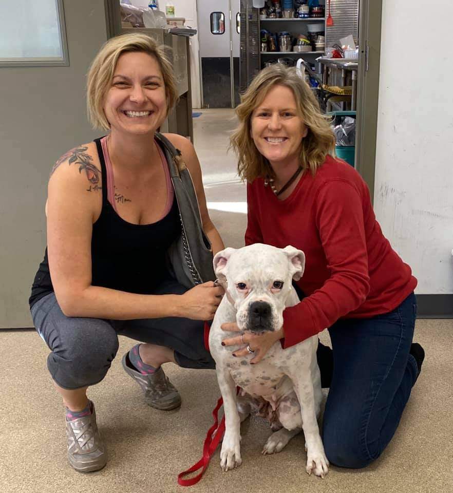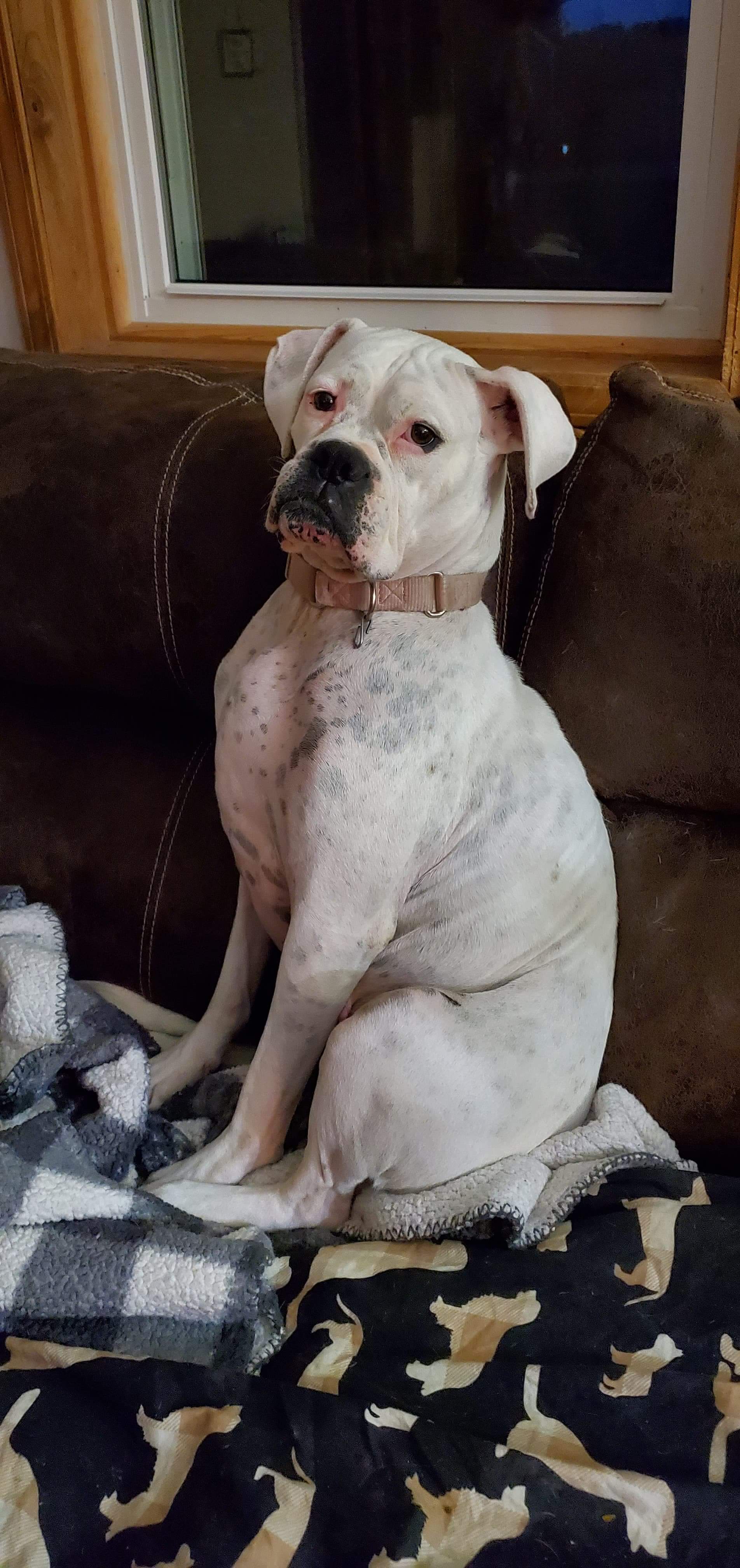 On August 15, 2020, I was sent an message from Amy Collins with Holly Crotty, Director of Taps added also. Amy had sent me a request 2 yrs ago when we saved Nellie (also a white boxer); She asked if I was ready for my next Boxer? She also sent a picture of this very emaciated white boxer. She said she was at the local animal control and she could not find a local foster -super sweet and was taken off of the streets. Of course I said yes, hoping that she got along with my 4 dogs that live with me. On August 21, 2020 I got to meet this sweet adorable girl, but I was shocked at the shape she was in. She weighed 32lbs at original intake and now she was at 40lbs. It makes me sad even to this day with her healthy to look at those pictures. I personally think she will reach around 65 to 70 when at her healthy weight, she is around 58 to 60 now.