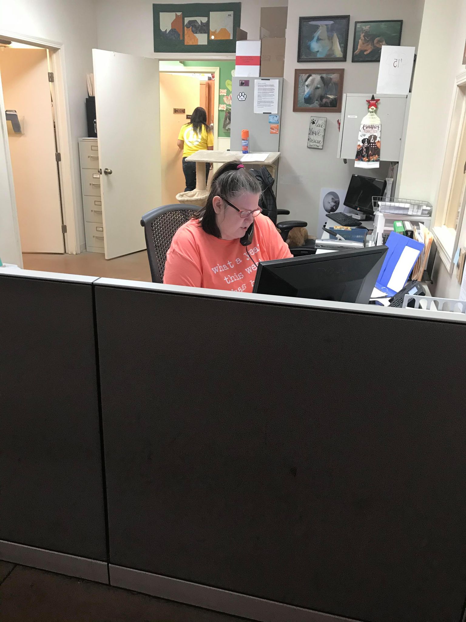 Prior to COVID, the front desk staff were supported by a variety of volunteers to help make their job easier. Since COVID, many of the volunteers are quarantining so the responsibilities, in large part, now fall directly to the front desk staff. We are grateful for Wendy, Lori, Maggie and Ashley who help download adoption applications remotely, so the front desk can jump straight into listening to messages and processing applications when they come in the door.