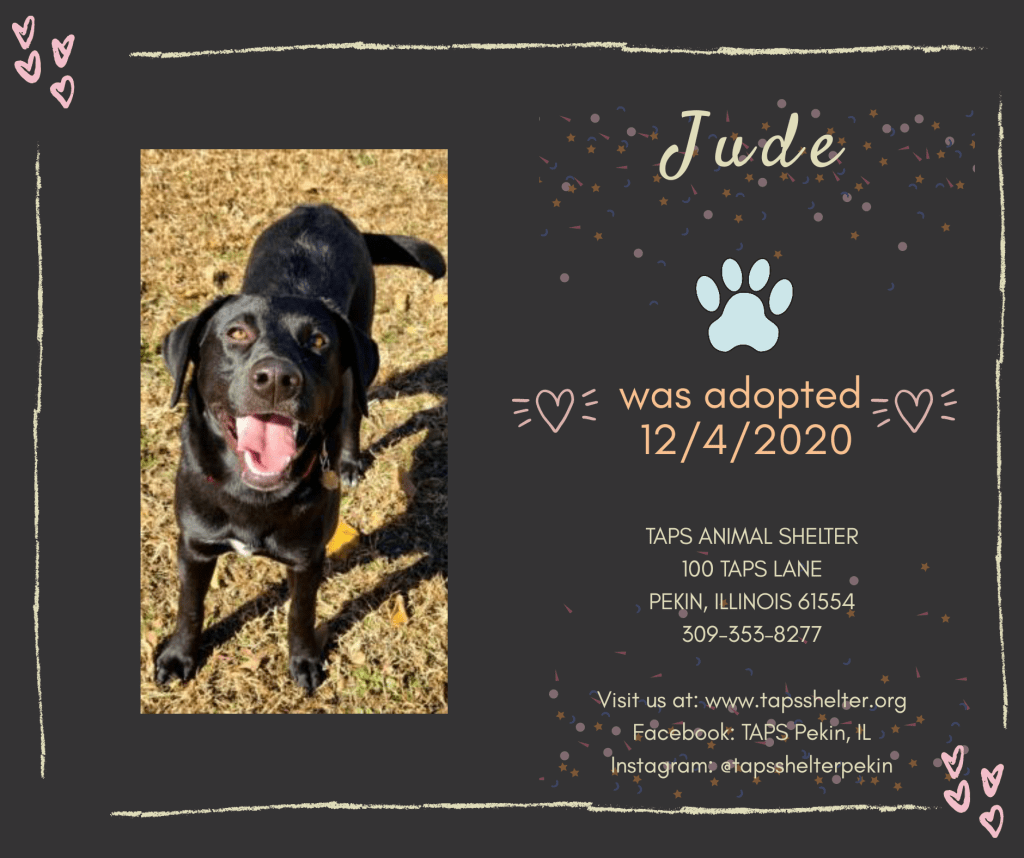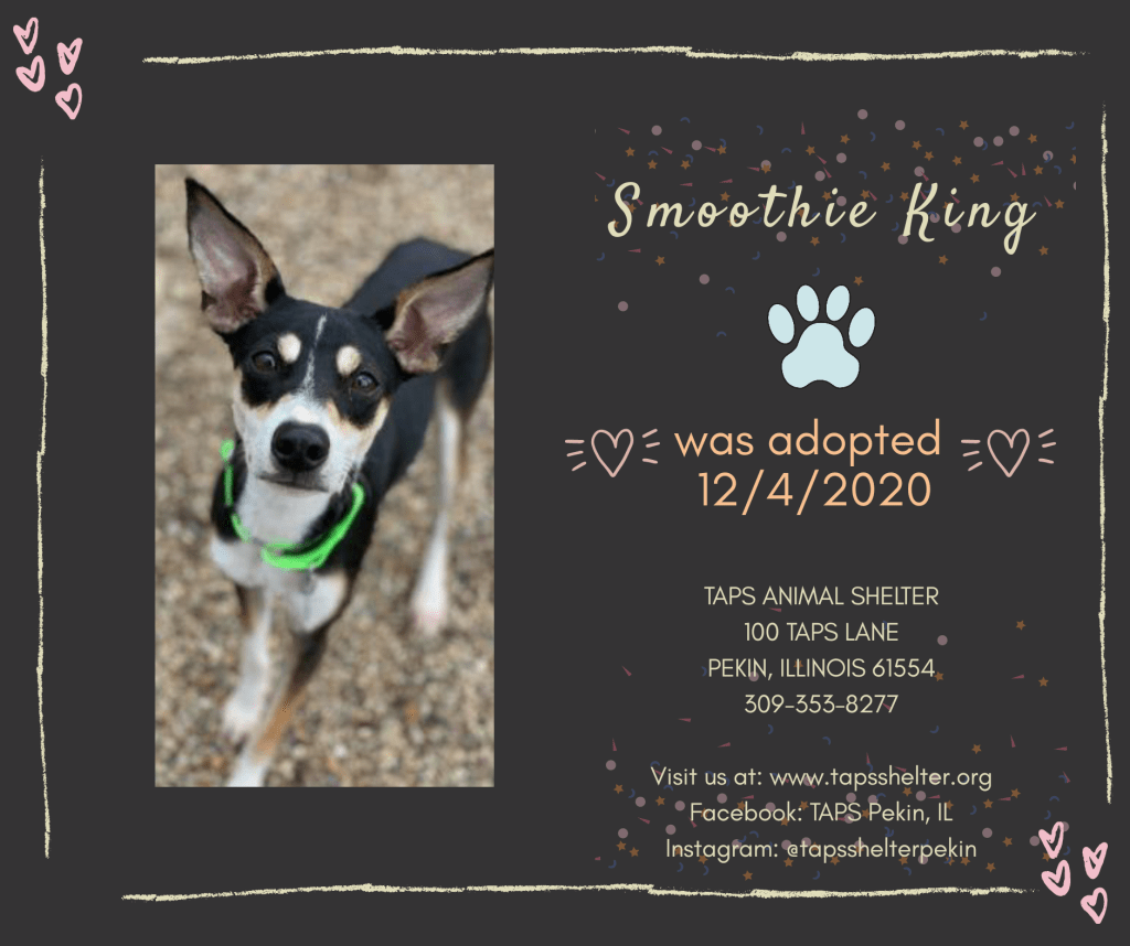 Adoptions for December 4, 2020 Posted bylindzamayDecember 5, 2020Posted inUncategorized Congratulations to Dill, Ebony, Giblet, Dewdrop, Dudley, Jude, and Smoothie King for finding their forever homes today! Share this:TweetLike Loading... Related