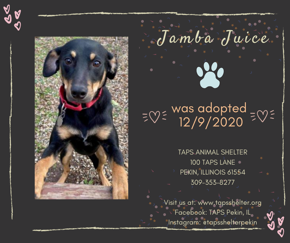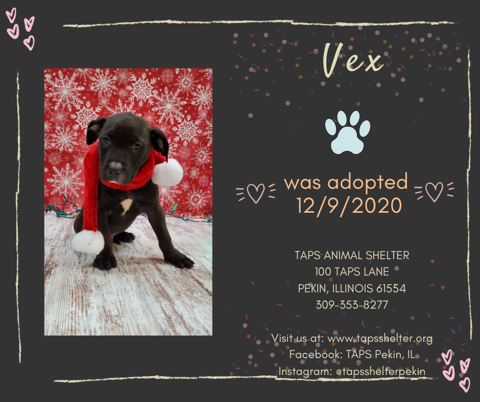 Adoptions for December 9, 2020 Posted bylindzamayDecember 10, 2020Posted inUncategorized Congratulations to Vex, Jamba Juice, Rubik, Cash, O’Reilly, and Susie for finding their forever homes today! Share this:TweetLike Loading... Related